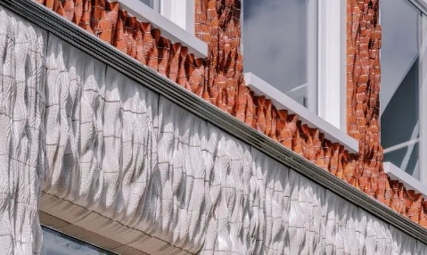 通過3D掃描原始和相鄰的立面,新的結(jié)構(gòu)得以精確對(duì)齊。在地面層,將瓷磚涂成珠光白色,略帶黃色;而上層則由3D打印“磚塊”組成,這些磚塊涂上三種紅色的釉面,并通過激光切割的鋼固定到位,形成盒式結(jié)構(gòu)。