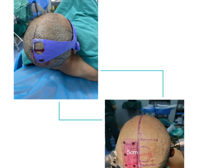 通過專業(yè)軟件對腫瘤和頭部外形進(jìn)行建模,清晰地確定腫瘤與頭部的位置關(guān)系,進(jìn)而找出手術(shù)的最優(yōu)路徑。接著利用 3D 打印技術(shù)設(shè)計定位導(dǎo)板,從而確定手術(shù)切口,以最小的手術(shù)切口和最為精細(xì)化的手術(shù)操作將腫瘤切除。