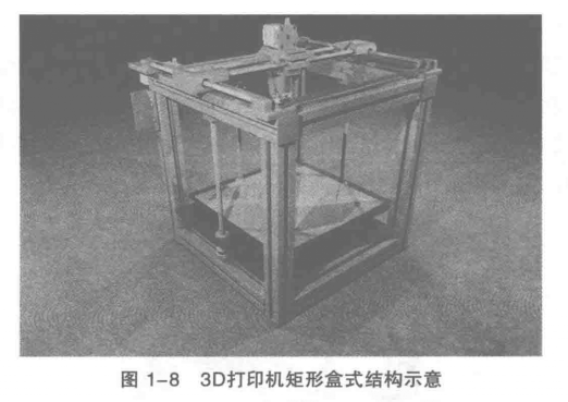矩形盒式結(jié)構(gòu)的機(jī)器是整個(gè)3D打印發(fā)展歷程中較為完整的,普及面最廣。這種機(jī)器的打印平臺沿Z軸移動,XY軸的移動由打印頭完成。由于打印平臺上的物體不會有XY軸方向的移動,因此物體在打印過程中不會發(fā)生移位,減輕打印頭的重量有助于提高打印速度和打印精度,其結(jié)構(gòu)如圖所示。矩形盒式結(jié)構(gòu)的打印機(jī)在打印精度、打印速度和安裝精度上比較有優(yōu)勢,但裝配過程較為復(fù)雜,維修也有一定難度。